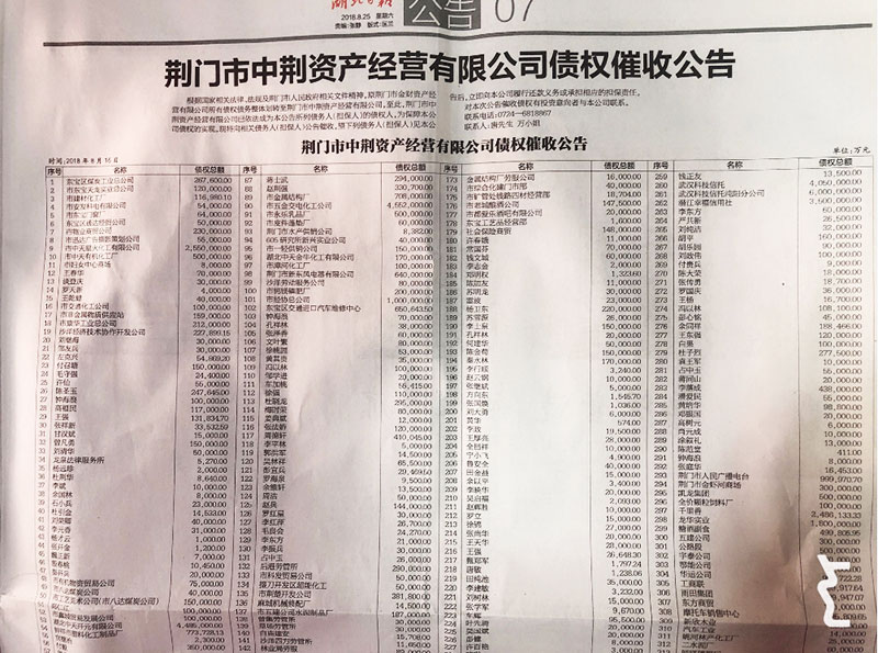 根據(jù)國(guó)家相關(guān)法律、法規(guī)及相關(guān)部門文件規(guī)定,為保障我公司債權(quán)的實(shí)現(xiàn),市中荊資產(chǎn)公司于2018年8月25日在湖北日?qǐng)?bào)分別刊登了《荊門市金貿(mào)資產(chǎn)經(jīng)營(yíng)有限公司債權(quán)催收公告》和《荊門市中荊資產(chǎn)經(jīng)營(yíng)有限公司債權(quán)催收公告》。通過媒體來催收債務(wù),有利于形成輿論監(jiān)督,督促債務(wù)人履行債務(wù),也有利于社會(huì)誠(chéng)信體系的建立。